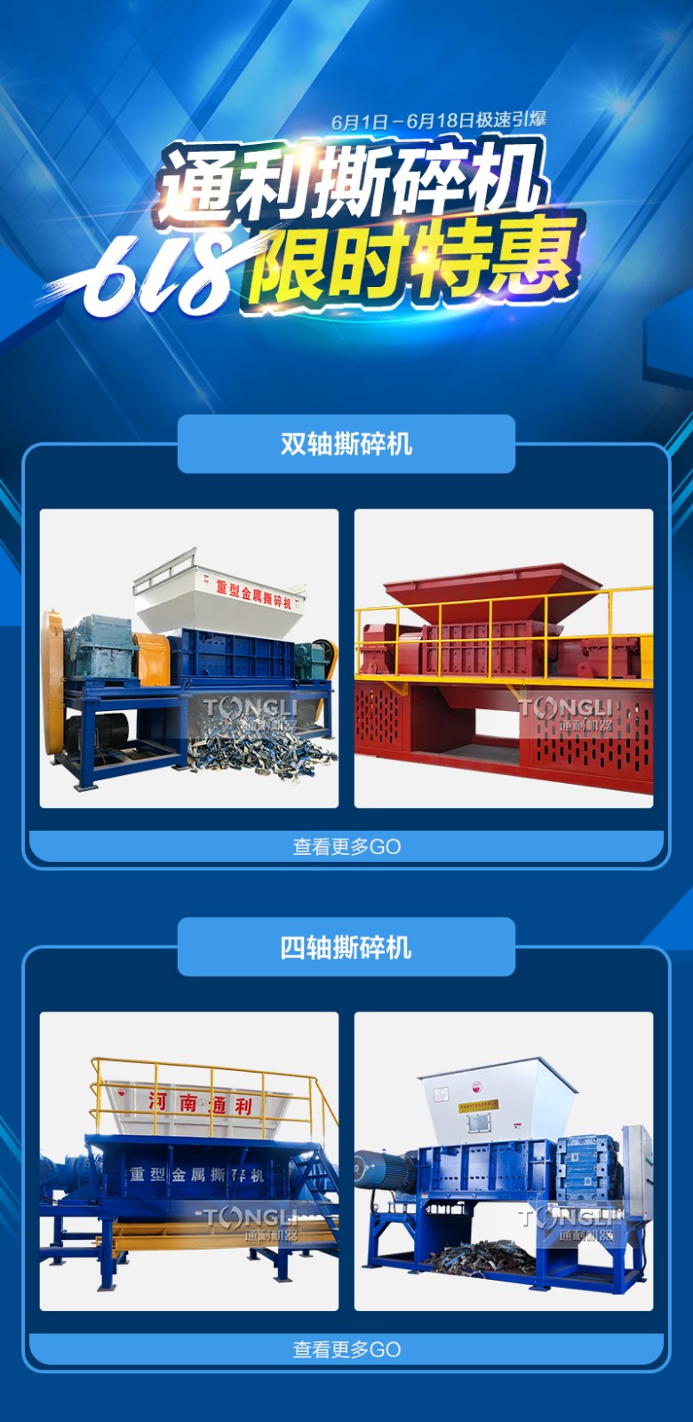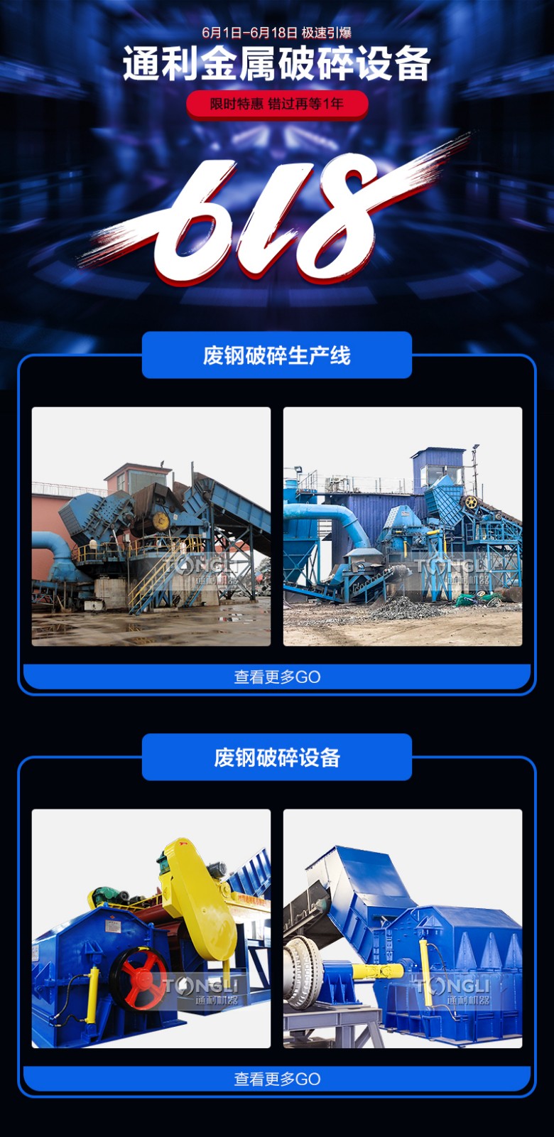 一年一度的6.18馬上要來臨了,各個廠家,網購app,實體店等等都紛紛為了這次活動卯足了勁兒,這不,趁著此次活動,河南通利廠家也來搞個促銷,廠區現有的中小型金屬破碎機,單機,整套購買均有不同折扣的惠活動,款款現貨等您來。